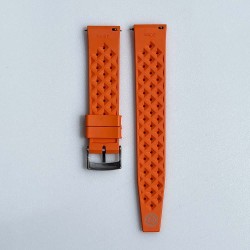 Orange TROPIC watchband in heat-vulcanised rubber. Undeformable and resistant, this is a diving or vintage watch strap. Unalterable and waterproof, it is equipped with a stainless steel buckle and stainless steel quick release system (automatic spring bar). BNO brand – Bracelet Nato - BNO logo on buckle and strap.