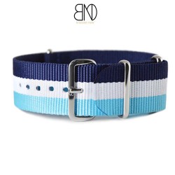 Bracelet NATO rayé bleu blanc bleu. Facile à installer, il est résistant à l'eau et indéformable. Mondialement célèbre depuis son apparition au bras de James Bond !...