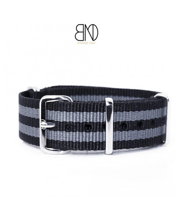Bracelet NATO noir et gris nylon original. Facile à installer, il est résistant à l'eau et indéformable. Mondialement célèbre depuis son apparition au bras de James...