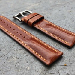 Bracelet de montre LUCCA marron doré handmade réalisé en cuir toscan, au bombé bien marqué. Il témoigne du savoir-faire artisanal italien. Cuir toscan tanné en fosse et teinté au tonneau avec patine transparente. Une finition main qui lui donne de la patine et un aspect indémodable, avec une puissante couture contrastante. Ce bracelet est une pièce de maître totalement fabriquée main en Autriche. Systeme attache rapide quick release inclus sur ce bracelet.