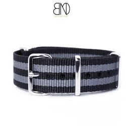 Bracelet NATO noir et gris nylon original. Facile à installer, il est résistant à l'eau et indéformable. Mondialement célèbre depuis son apparition au bras de James Bond ! Bracelet ajustable à tous les diamètres de poignets. Fabrication de très haute qualité avec un packaging luxueux. Ce NATO Original est vendu en bijouterie et reste de loin le meilleur du marché (boucle de fermeture non déformable). Il existe en différentes largeurs, il suffit de mesurer la largeur d’entrecorne de votre montre.