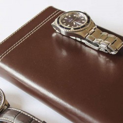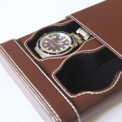 Cet étui en cuir marron pour montres permet le rangement (à plat) de deux montres taille classique à XL. La structure extérieure est recouverte de cuir naturel. Chaque place fournit l'espace nécessaire pour la couronne ou les poussoirs (diamètre des emplacements 52mm). Ecrin coulissant, interieur velour noir. Toute montre, même de petit diamètre, y sera calée et protégée.